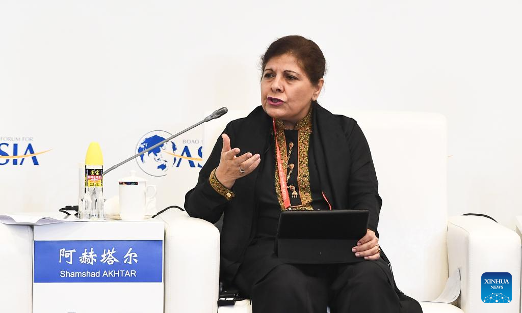 Shamshad Akhtar, federal minister for Finance, Revenue and Economic Affairs of Pakistan, speaks at a panel discussion themed on "Investing the Future of Asia" during the Boao Forum for Asia (BFA) Annual Conference 2024 in Boao, south China's Hainan Province, March 26, 2024. (Xinhua/Yang Guanyu)