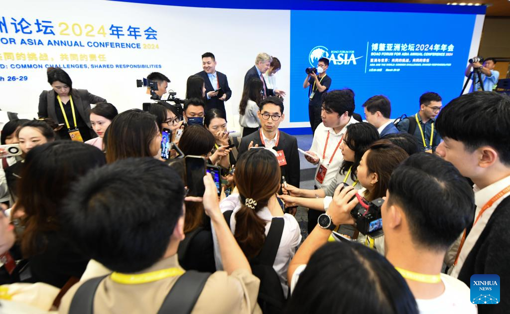 Max Yuan (C), founder, Chairman and CEO of Xiao-i Corporation, answers journalists' questions after a panel discussion themed on "How Far is the Breakthrough Moment of Technological Revolution?" during the Boao Forum for Asia (BFA) Annual Conference 2024 in Boao, south China's Hainan Province, March 26, 2024. (Xinhua/Yang Guanyu)