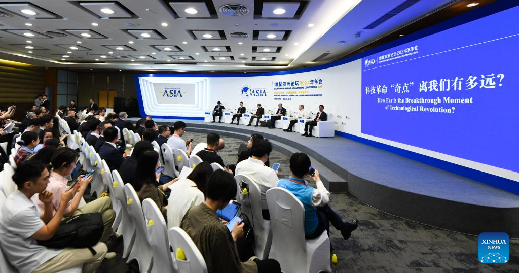 A panel discussion themed on "How Far is the Breakthrough Moment of Technological Revolution?" is held during the Boao Forum for Asia (BFA) Annual Conference 2024 in Boao, south China's Hainan Province, March 26, 2024. (Xinhua/Yang Guanyu)
