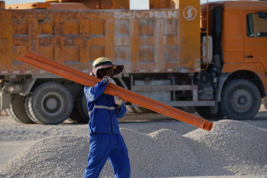 A man works at the construction site of redevelopment project of Aiwo Harbor in the Republic of Nauru, Jan. 18, 2024. (Xinhua/Wang Shen)