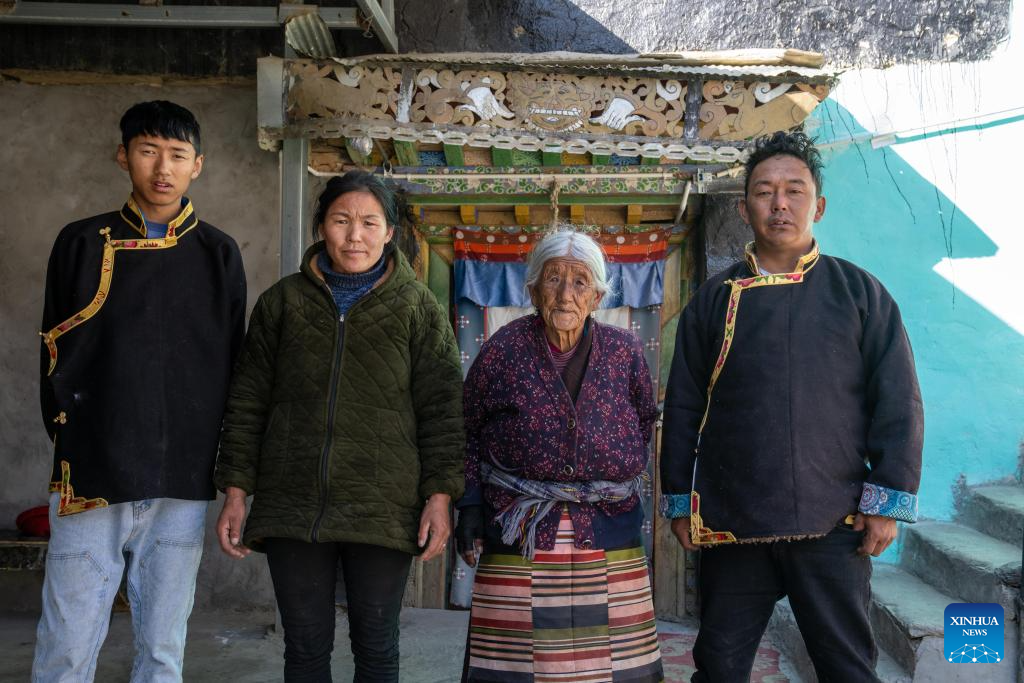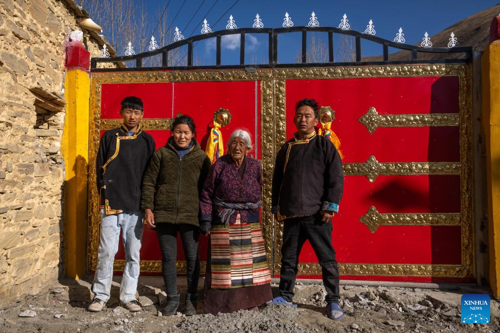 Kelsang Chodron (2nd R) poses for photo with her family members in Changkhyim Village in Qonggyai County of Shannan, southwest China's Xizang Autonomous Region, March 16, 2024. (Xinhua/Tenzing Nima Qadhup)