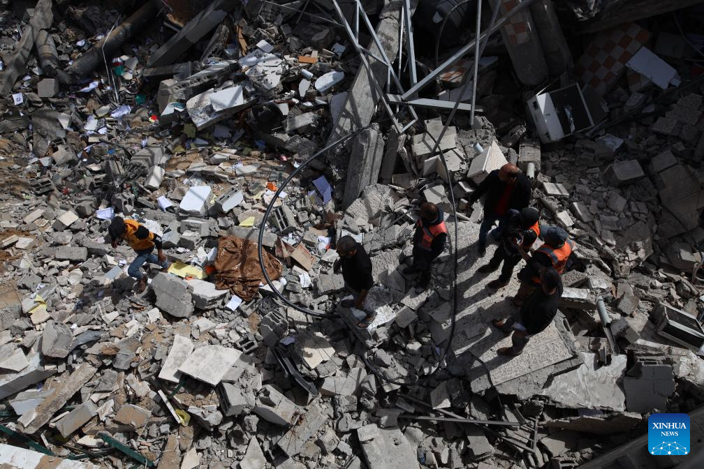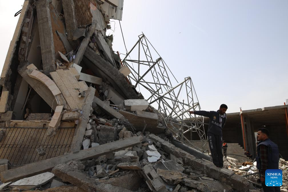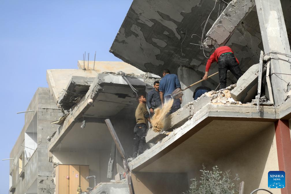 People are seen among the rubble of a destroyed building after Israeli strikes in the town of al-Zawaida in central Gaza Strip, on March 27, 2024. The Palestinian death toll from ongoing Israeli attacks has risen to 32,490, the Hamas-run Health Ministry said on Wednesday. (Xinhua)