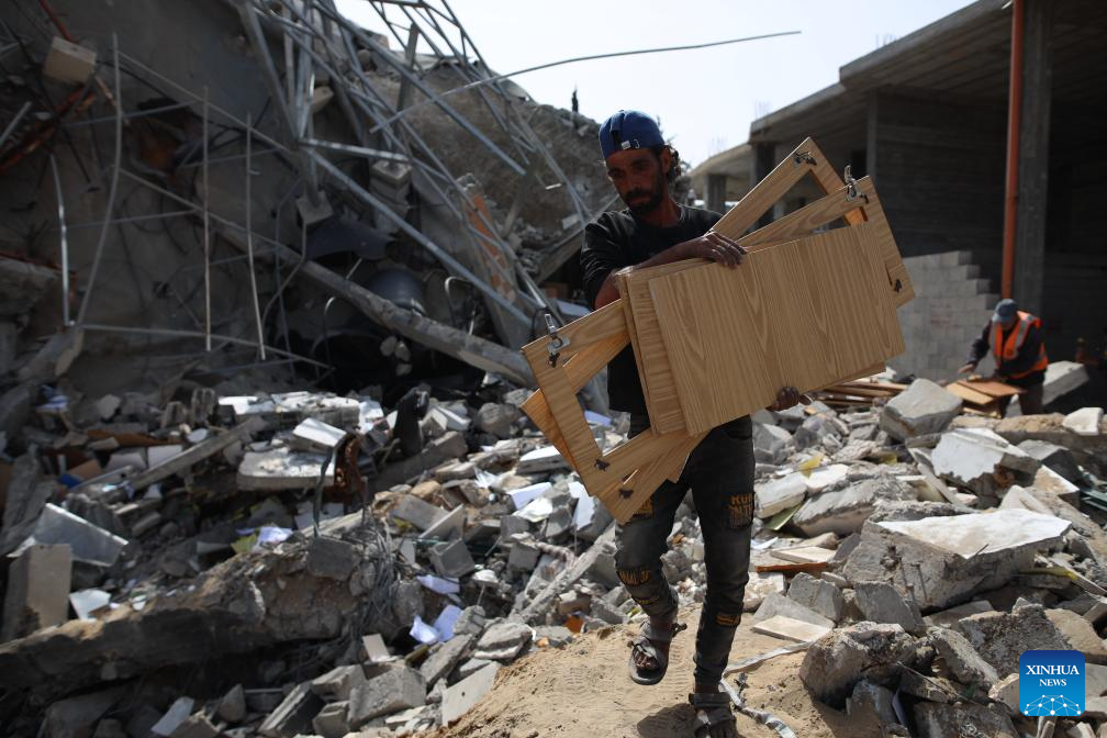 A man collects items after Israeli strikes in the town of al-Zawaida in central Gaza Strip, on March 27, 2024. The Palestinian death toll from ongoing Israeli attacks has risen to 32,490, the Hamas-run Health Ministry said on Wednesday. (Xinhua)