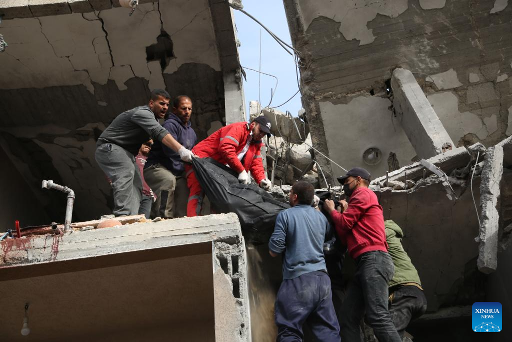 People conduct rescue work after an Israeli airstrike in the southern Gaza Strip city of Rafah, on March 27, 2024. The Palestinian death toll from ongoing Israeli attacks has risen to 32,490, the Hamas-run Health Ministry said on Wednesday. (Photo by Khaled Omar/Xinhua)