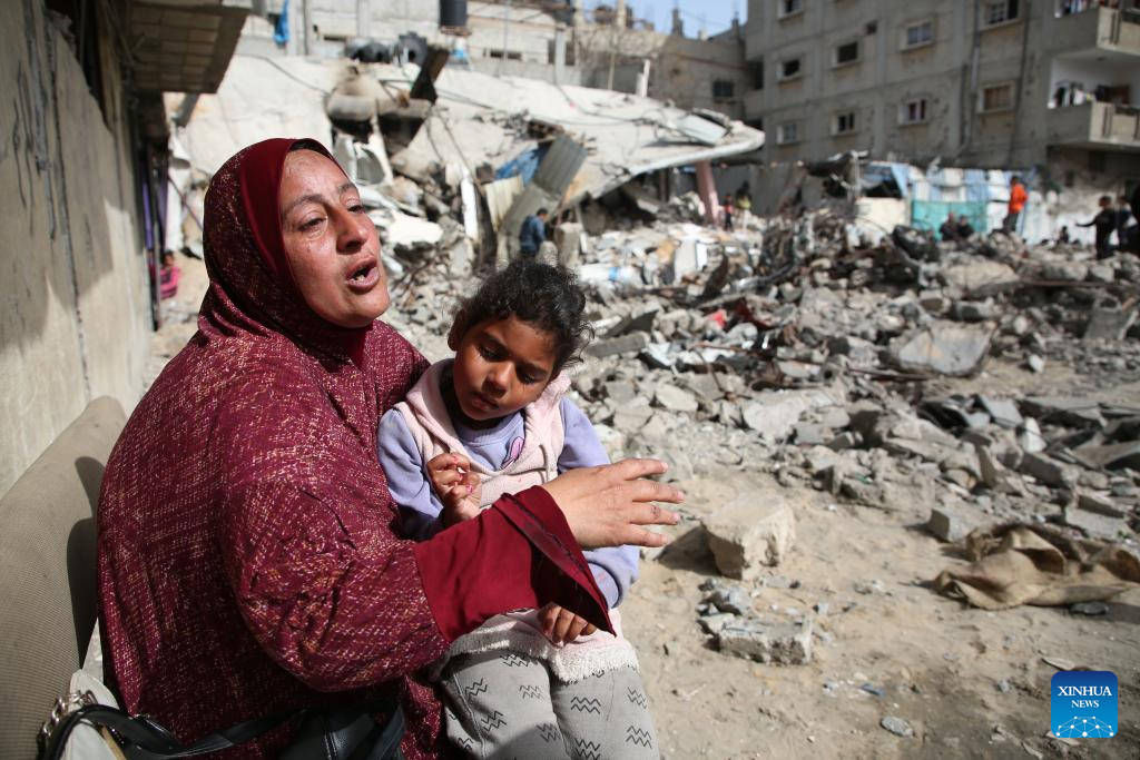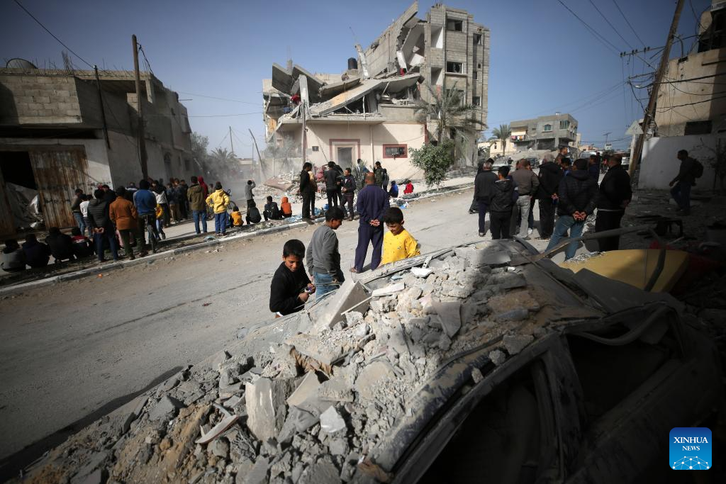 People gather around a destroyed building after an Israeli airstrike in the southern Gaza Strip city of Rafah, on March 27, 2024. The Palestinian death toll from ongoing Israeli attacks has risen to 32,490, the Hamas-run Health Ministry said on Wednesday. (Photo by Yasser Qudih/Xinhua)