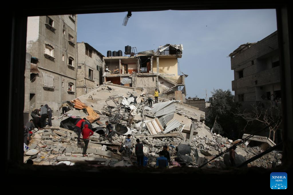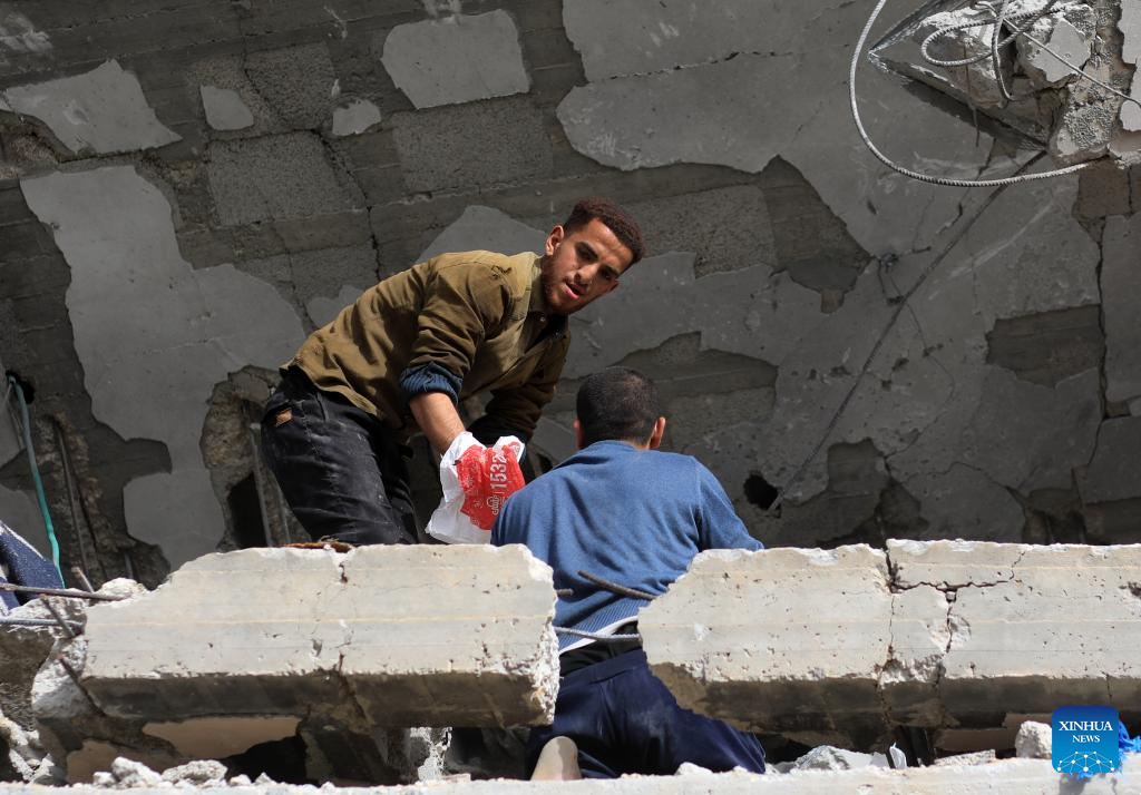 People search among the rubble of a building destroyed in an Israeli airstrike in the southern Gaza Strip city of Rafah, on March 27, 2024. The Palestinian death toll from ongoing Israeli attacks has risen to 32,490, the Hamas-run Health Ministry said on Wednesday. (Photo by Khaled Omar/Xinhua)