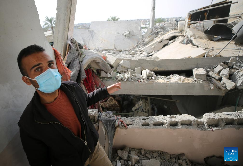 People are seen at a building destroyed in an Israeli airstrike in the southern Gaza Strip city of Rafah, on March 27, 2024. The Palestinian death toll from ongoing Israeli attacks has risen to 32,490, the Hamas-run Health Ministry said on Wednesday. (Photo by Khaled Omar/Xinhua)