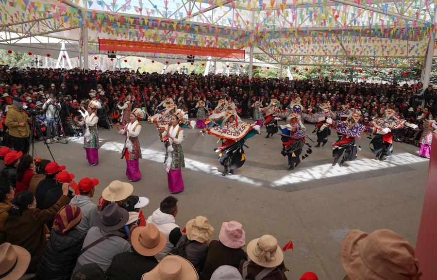 People watch a performance at a park to celebrate the Serfs' Emancipation Day in Lhasa, capital of southwest China's Xizang Autonomous Region, March 28, 2024. (Xinhua/Jigme Dorje)