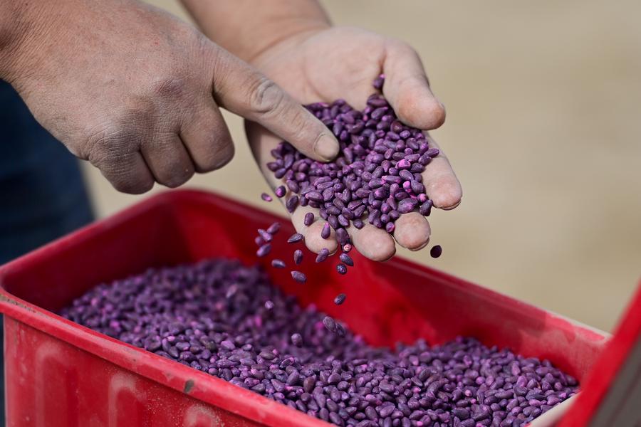 A farmer checks cotton seeds at a farmland in Awat County of Aksu, northwest China's Xinjiang Uygur Autonomous Region, March 27, 2024. (Xinhua/Ding Lei)