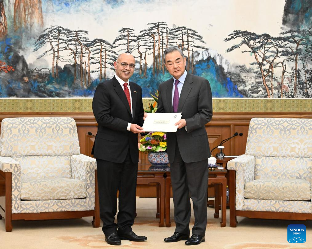 Chinese Foreign Minister Wang Yi, also a member of the Political Bureau of the Communist Party of China Central Committee, meets with Ahmed Mustafa Fahmy, new head of the League of Arab States' China representative office, in Beijing, capital of China, March 28, 2024. Fahmy submitted his letter of appointment to Wang Yi here on Thursday. (Xinhua/Shen Hong)