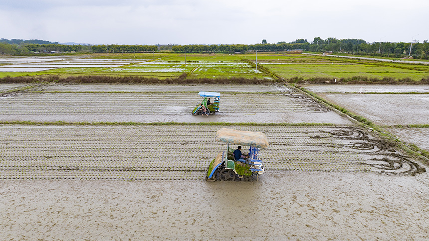 Farmers operate machines to transplant rice seedlings on a field in Binyang county, Nanning city, south China's Guangxi Zhuang Autonomous Region.