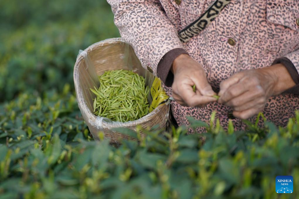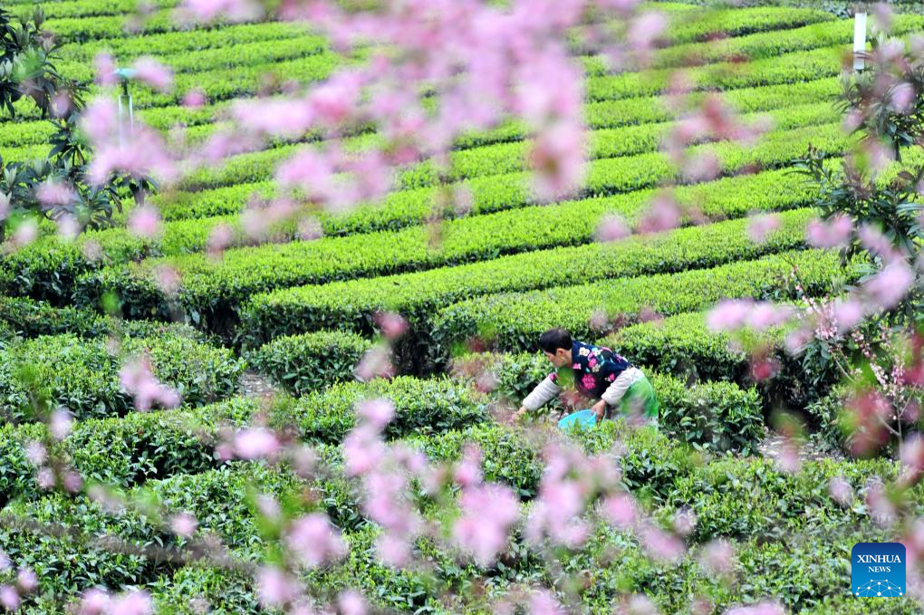 Farmers pick tea leaves at tea gardens in Ninghong Village in Xiushui County, east China's Jiangxi Province, March 28, 2024. Tea farmers and enterprises are busy harvesting and processing spring tea leaves to meet the consumer demand lately. (Xinhua/Wan Xiang)
