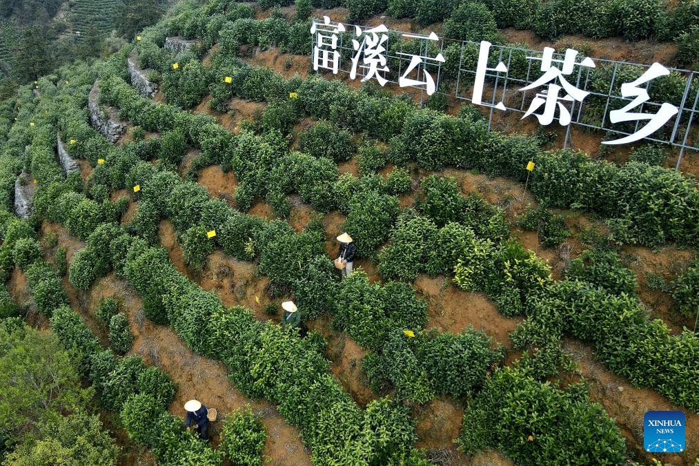 A drone photo shows farmers picking tea leaves at a tea garden in Fuxi Township in Huangshan City, east China's Anhui Province, March 28, 2024. Tea farmers and enterprises are busy harvesting and processing spring tea leaves to meet the consumer demand lately. (Xinhua/Huang Bohan)