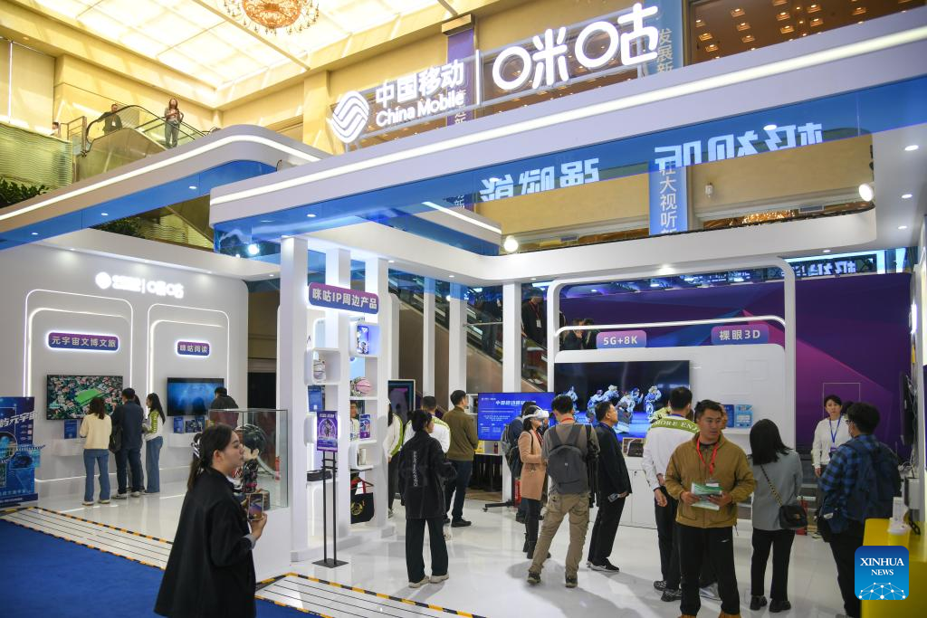 People visit an exhibition on new technologies and video and audio programs at the 11th China Internet Audio and Video Convention in Chengdu, southwest China's Sichuan Province, March 28, 2024. The 11th China Internet Audio and Video Convention, demonstrating a series of cutting-edge technologies, opened on Thursday in Chengdu, capital of southwest China's Sichuan Province. Focusing on innovation and industrial upgrades, the three-day event has attracted participating enterprises to display their technologies in 5G+8K, 3D, cloud gaming and other sectors. (Xinhua/Xu Bingjie)