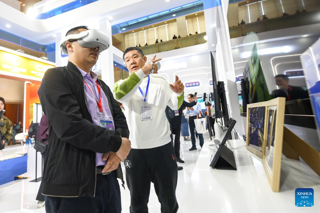 A visitor learns about a VR device during an exhibition of the 11th China Internet Audio and Video Convention in Chengdu, southwest China's Sichuan Province, March 28, 2024. The 11th China Internet Audio and Video Convention, demonstrating a series of cutting-edge technologies, opened on Thursday in Chengdu, capital of southwest China's Sichuan Province. Focusing on innovation and industrial upgrades, the three-day event has attracted participating enterprises to display their technologies in 5G+8K, 3D, cloud gaming and other sectors. (Xinhua/Tang Wenhao)