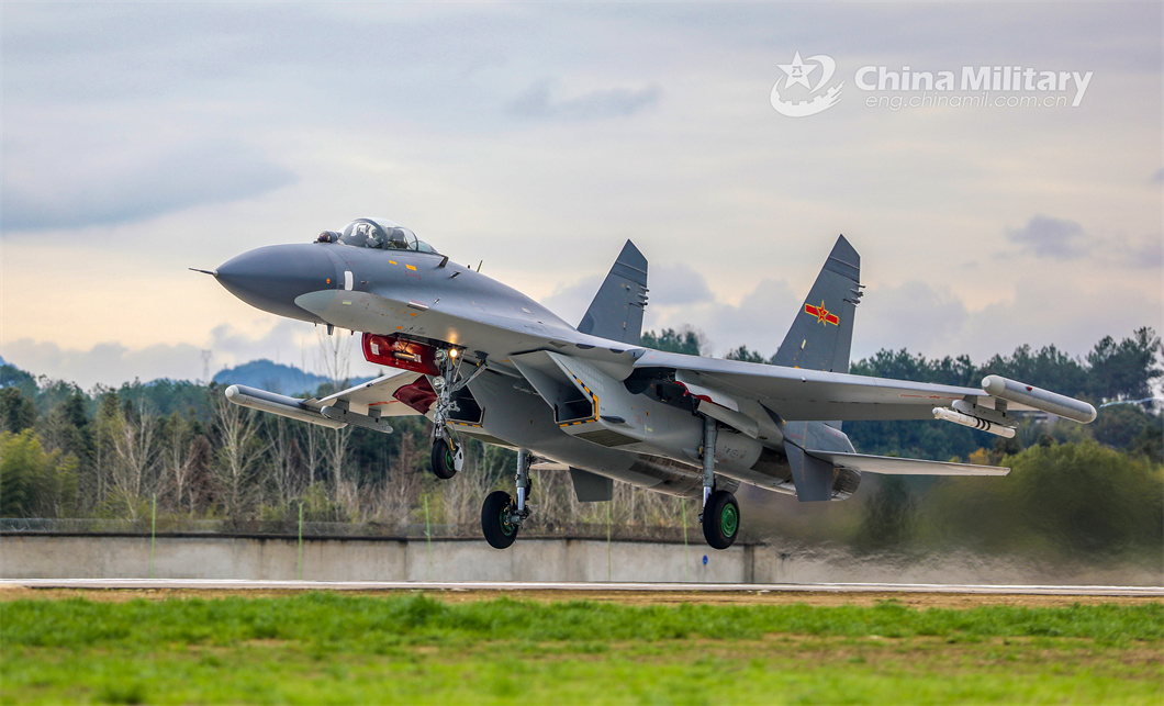 A fighter jet attached to an aviation brigade with the air force under the PLA Eastern Theater Command takes off for a flight training exercise on March 17, 2024. (eng.chinamil.com.cn/Photo by Fu Gan)
