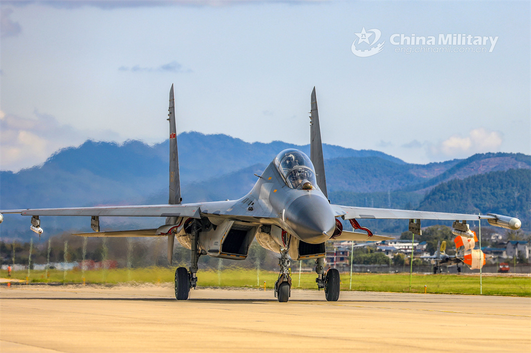 A fighter jet attached to an aviation brigade with the air force under the PLA Eastern Theater Command taxis on the runway before takeoff for a flight training exercise on March 17, 2024. (eng.chinamil.com.cn/Photo by Fu Gan)
