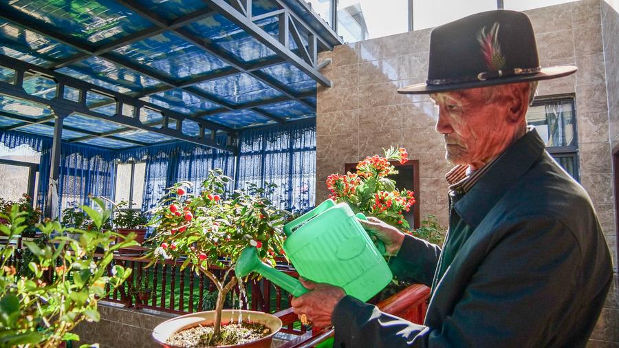 Sonam Dondrup waters flowers at his home in Khesum, southwest China's Xizang Autonomous Region, March 1, 2024. (Xinhua/Purbu Tsering)