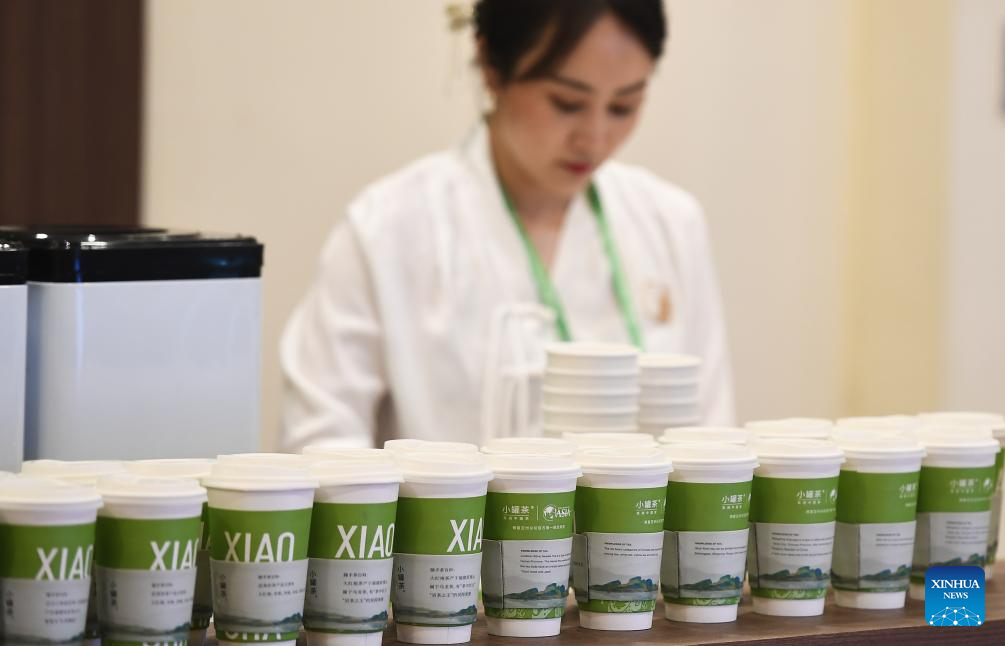 Cups made from recycled materials are seen during the Boao Forum for Asia (BFA) Annual Conference 2024 in Boao, south China's Hainan Province, March 26, 2024. The BFA Annual Conference 2024 was held from March 26 to 29 in Boao, with a series of consensus reached.