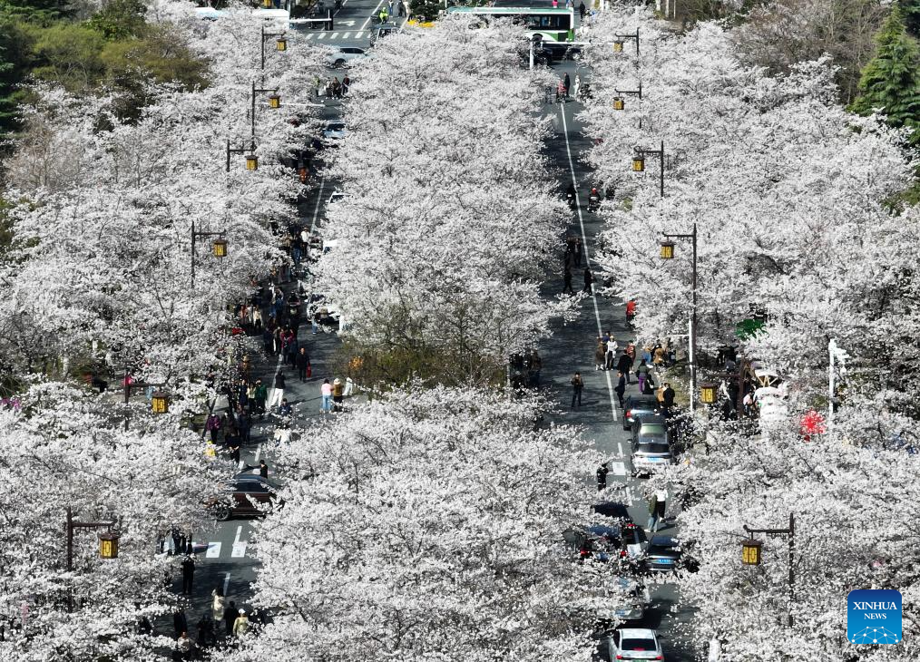 An aerial drone photo taken on March 29, 2024 shows cherry blossoms in Yangzhou, east China's Jiangsu Province. The warm weather and blooming flowers are attracting people out of their homes to enjoy the spring. (Photo by Meng Delong/Xinhua)