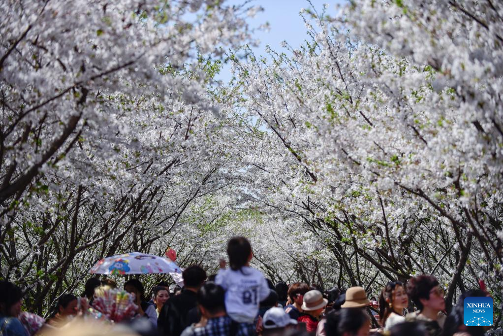 People take photos at a scenic area in Chahe Town of Bijie, southwest China's Guizhou Province, March 28, 2024. The warm weather and blooming flowers are attracting people out of their homes to enjoy the spring. (Photo by Mao Yuanhui/Xinhua)