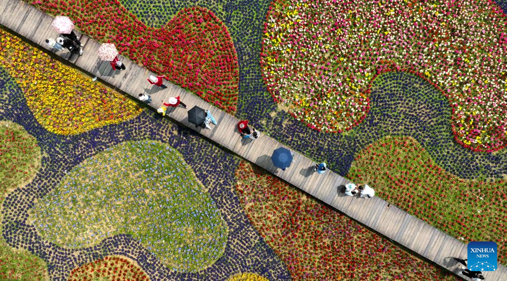 An aerial drone photo shows tourists enjoying flowers at a scenic spot in Guiyang City, southwest China's Guizhou Province, March 31, 2024. (Photo by Yuan Fuhong/Xinhua)