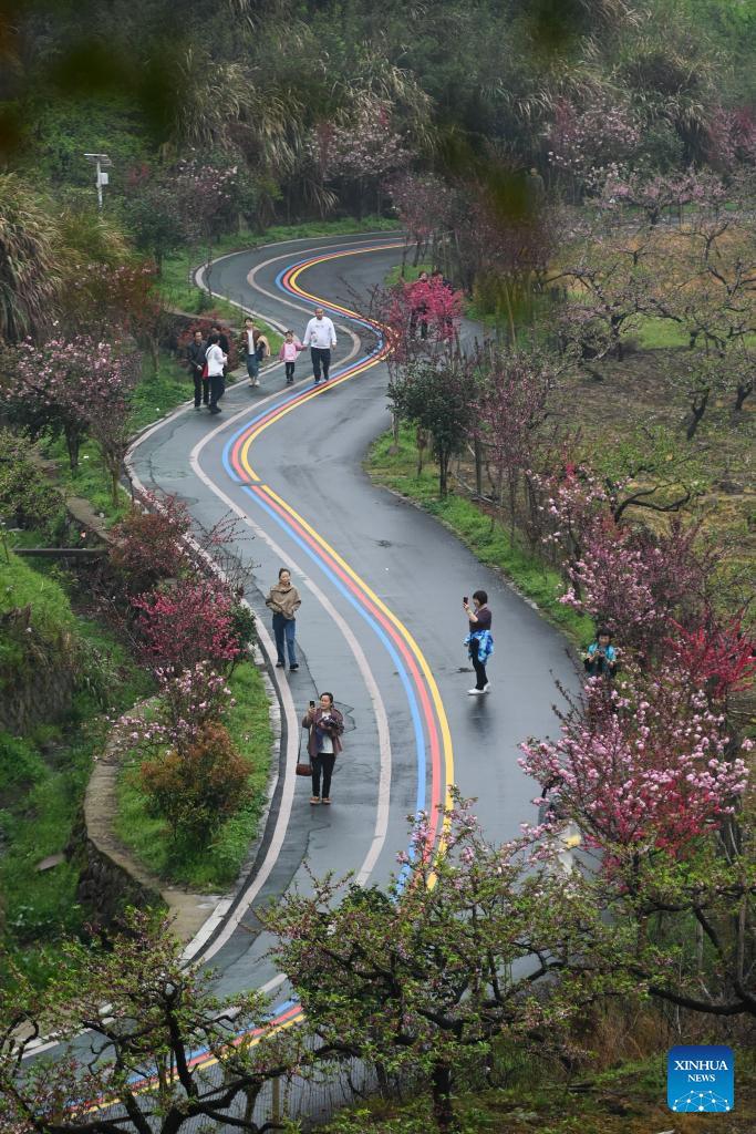 Tourists enjoy cherry blossoms in Jinlong Village of Daguan Town, southwest China's Chongqing, March 30, 2024. (Photo by Ju Mingbin/Xinhua)