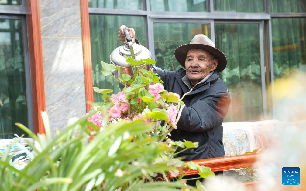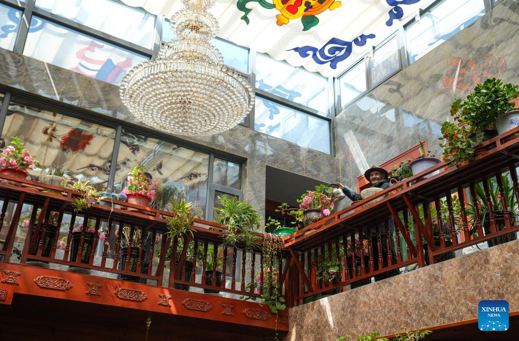 Namgyal waters plants at his home in Doilungdeqen District of Lhasa, southwest China's Xizang Autonomous Region, March 13, 2024.