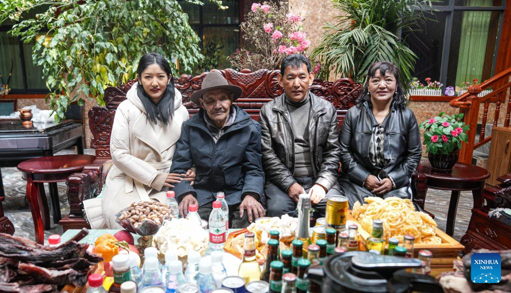 Namgyal (2nd L) and family members pose for a photo at his home in Doilungdeqen District of Lhasa, southwest China's Xizang Autonomous Region, March 13, 2024.