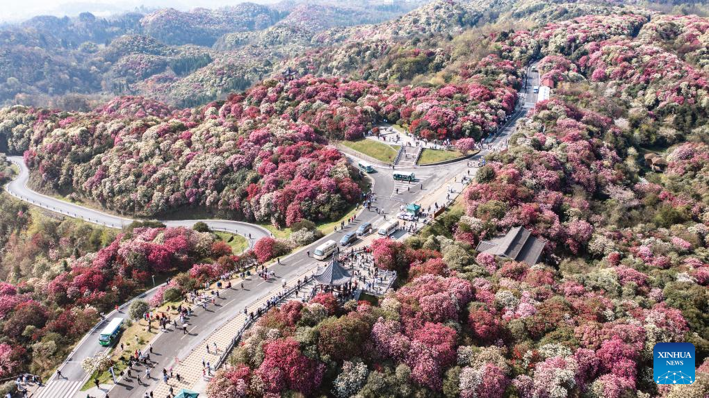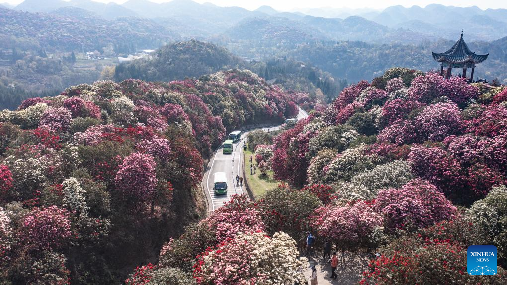 An aerial drone photo taken on March 30, 2024 shows tourists visiting an azalea scenic area in Bijie, southwest China's Guizhou Province. (Xinhua/Tao Liang)