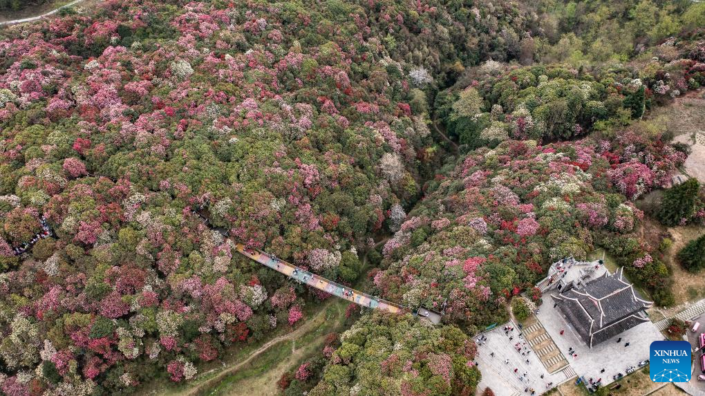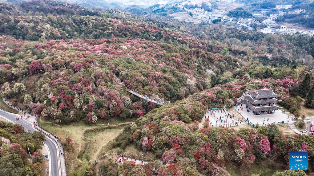An aerial drone photo taken on March 29, 2024 shows tourists visiting an azalea scenic area in Bijie, southwest China's Guizhou Province. (Xinhua/Tao Liang)