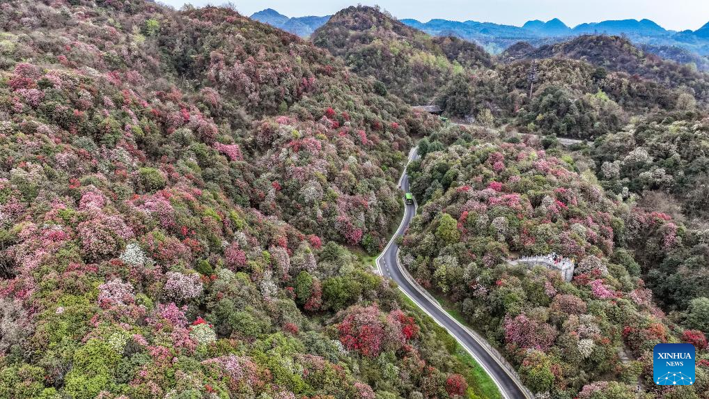 An aerial drone photo taken on March 30, 2024 shows a view of an azalea scenic area in Bijie, southwest China's Guizhou Province. (Xinhua/Tao Liang)