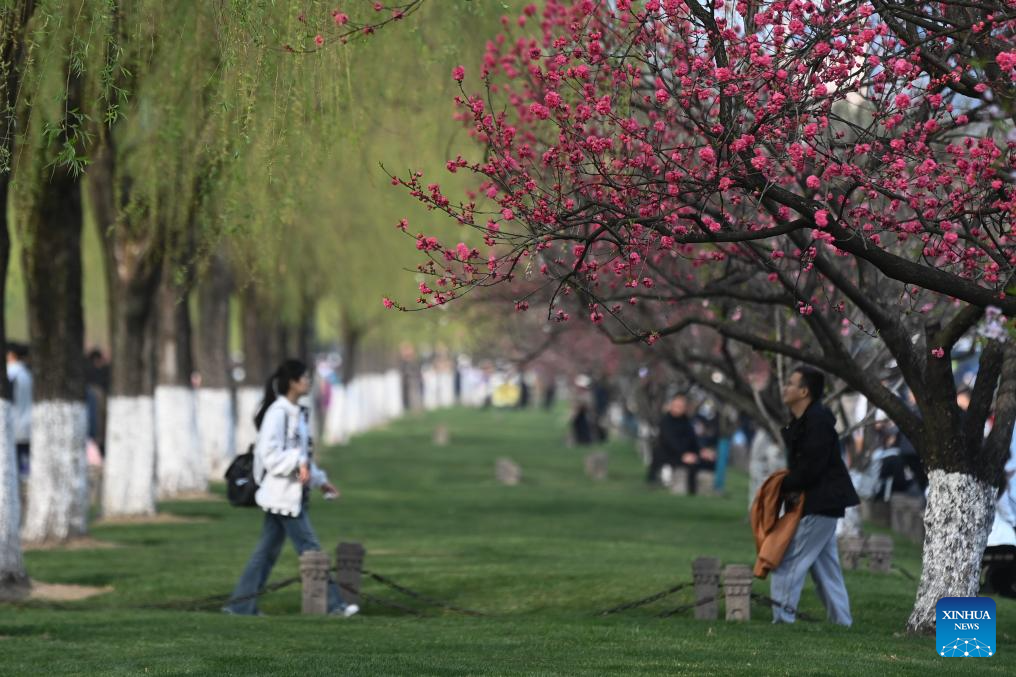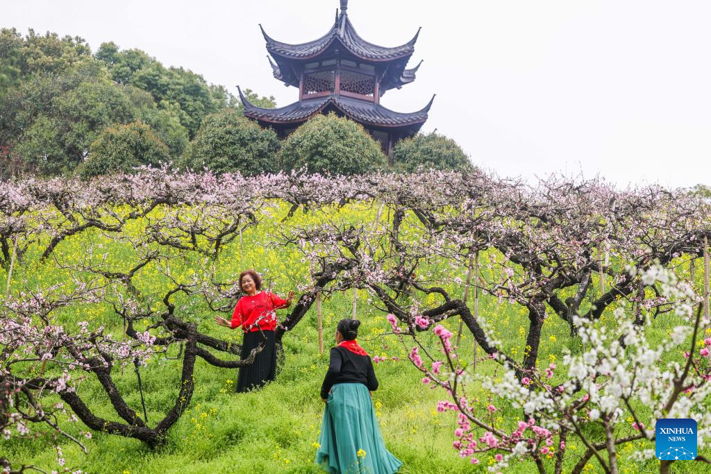 Tourists view plum blossoms at Yingzhou plum garden in Wuxing District of Huzhou, east China's Zhejiang Province, Feb. 27, 2024. (Xinhua/Huang Zongzhi)