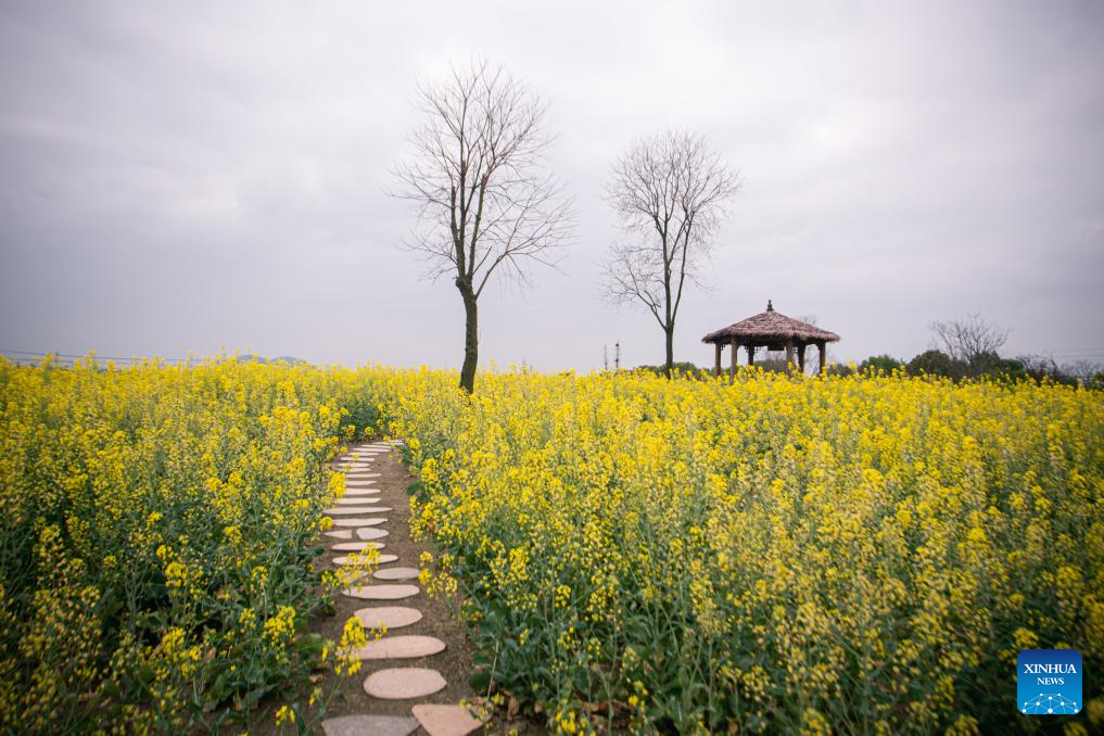This photo taken on March 26, 2024 shows blooming cole flowers in a field in Xinwei Village of Qiantang District in Hangzhou, east China's Zhejiang Province. (Xinhua/Jiang Han)