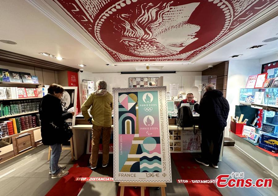 A poster of the official stamp for the Paris 2024 Olympic and Paralympic Games is displayed at a bookstore in Paris, France, March 29, 2024. (Photo: China News Service/Li Yang)