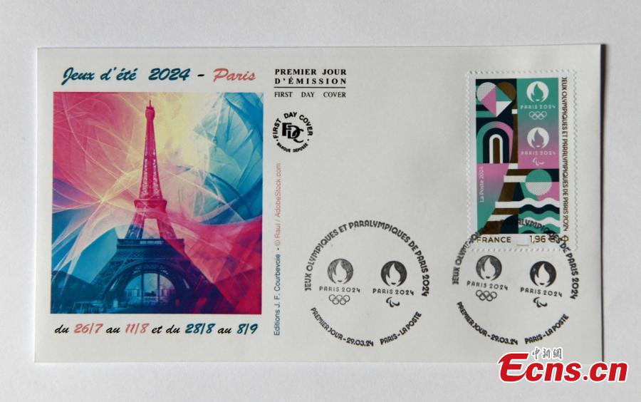 A first day cover stamp of the Paris 2024 Olympic and Paralympic Games is displayed in Paris, France, March 29, 2024. (Photo: China News Service/Li Yang)