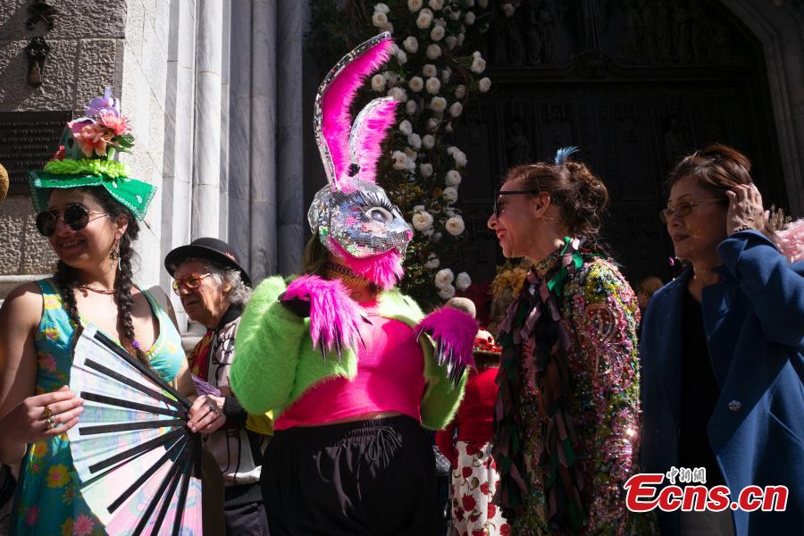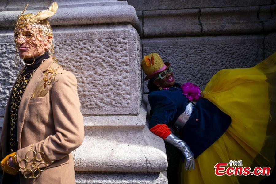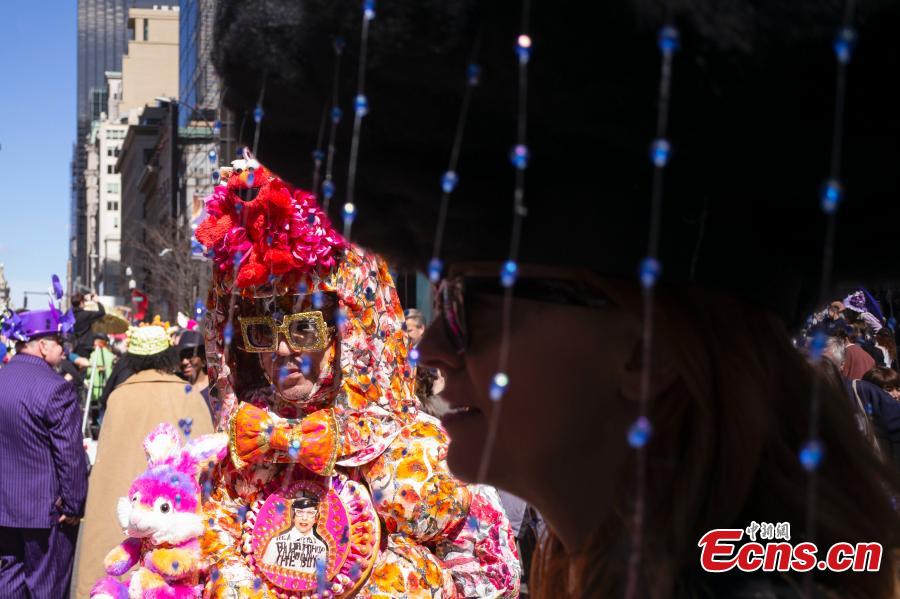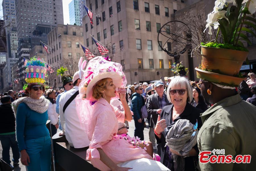 People wearing tall floral hats participate in the annual Easter Parade and Bonnet Festival on the fifth avenue in New York City, the United States, March 31, 2024. (Photo: China News Service/Liao Pan)