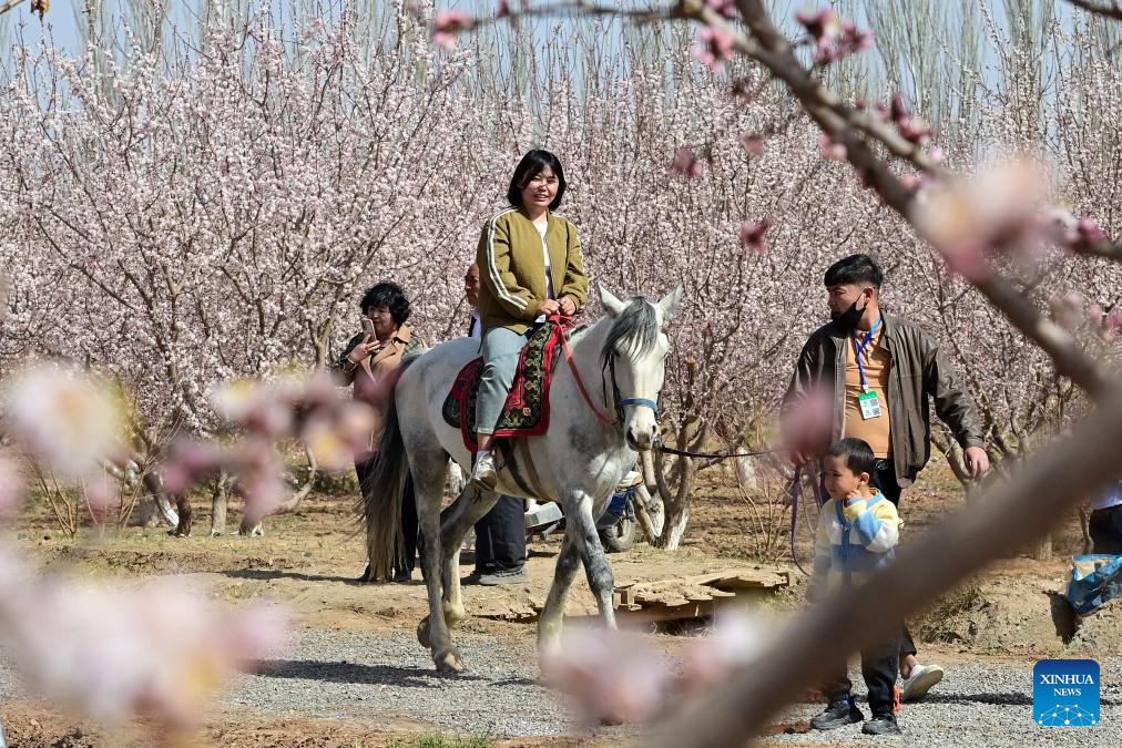 Tourists visit an apricot orchard during a cultural and tourism event held in Yaha Township of Kuqa County, northwest China's Xinjiang Uygur Autonomous Region, March 30, 2024. In recent years, local authorities of Kuqa have vigorously promoted large-scale and standardized apricot planting to increase income for local villagers. (Xinhua/Ding Lei)