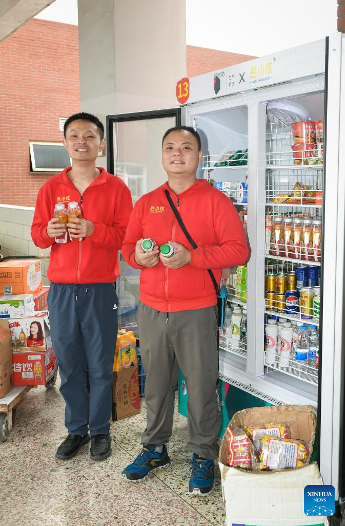 Autistic youths Huang Xuanning (L) and Cao Hongyi work at an industrial park in Shenzhen, south China's Guangdong Province, March 21, 2024. Huang Xuanning, 24, and Cao Hongyi, 27, joined the industrial park in September 2023. They are responsible for loading vending machines in the factory area, including handling and placing snacks and drinks. Now they are basically qualified for the job with the help of team partners. This Tuesday marks the 17th World Autism Awareness Day. In south China's Shenzhen, some autistic youth, who were called "children of the stars," have integrated into society and are chasing their dreams.?(Xinhua/Mao Siqian)