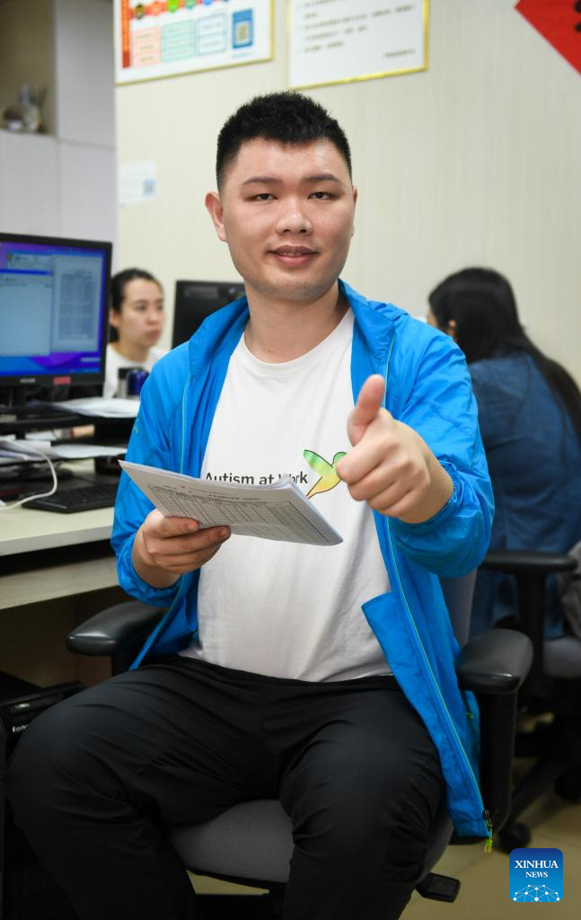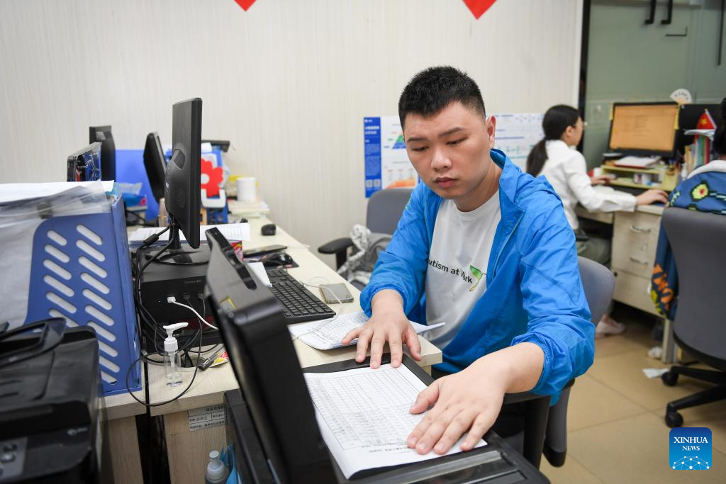 Dai Jinyu, a 29-year-old autistic youth, works at Shenzhen Autism Society in Shenzhen, south China's Guangdong Province, March 27, 2024. Dai Jinyu joined the organization in October 2018, mainly responsible for scanning and copying files and indoor disinfection. This Tuesday marks the 17th World Autism Awareness Day. In south China's Shenzhen, some autistic youth, who were called "children of the stars," have integrated into society and are chasing their dreams.?(Xinhua/Mao Siqian)