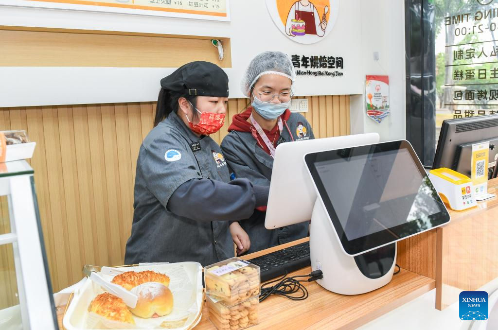 Autistic youths Yuan Anqi (L) and Qiu Minyi, work at a bakery in Shenzhen, south China's Guangdong Province, March 21, 2024. Yuan Anqi, 22, and Qiu Minyi, 28, are cashiers at the bakery since June 2023. With the help of their teacher, they could also make bread and cakes sometimes. This Tuesday marks the 17th World Autism Awareness Day. In south China's Shenzhen, some autistic youth, who were called "children of the stars," have integrated into society and are chasing their dreams.?(Xinhua/Zhao Ruixi)