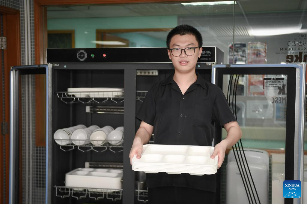 Autistic youth Guan Hao works at the staff dining hall of a hotel in Shenzhen, south China's Guangdong Province, March 27, 2024. Guan Hao, 23, joined the hotel in June 2021 as a waiter of the staff dining hall. Like other employees, he now works eight hours a day and is responsible for placing cleaned plates, cleaning up garbage and the hall. In the eyes of his leaders and colleagues, Guan is now a good employee. This Tuesday marks the 17th World Autism Awareness Day. In south China's Shenzhen, some autistic youth, who were called "children of the stars," have integrated into society and are chasing their dreams. (Xinhua/Mao Siqian)