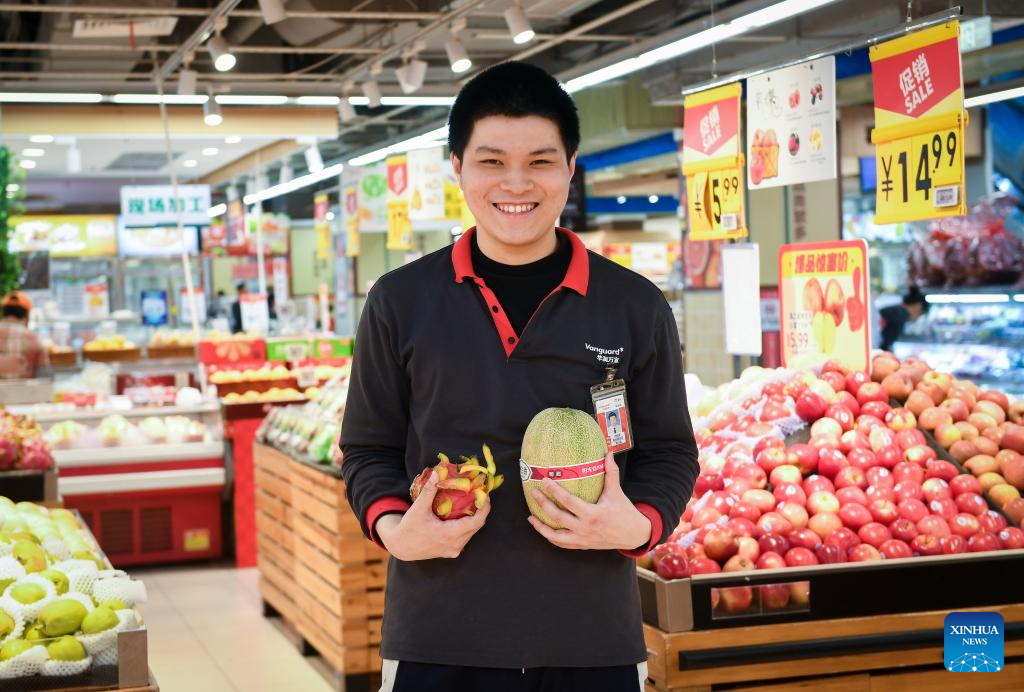 Autistic youth Ran Yulong, poses for a photo at a supermarket in Shenzhen, south China's Guangdong Province, March 22, 2024. Ran Yulong, 19, works ninety-six hours a month at the supermarket since September 2023. His main work is to sort out the goods in the fresh fruit and vegetable area and check the shelf life of the products. He shopped at the supermarket since he was a child and now became an employee here. This Tuesday marks the 17th World Autism Awareness Day. In south China's Shenzhen, some autistic youth, who were called "children of the stars," have integrated into society and are chasing their dreams.?(Xinhua/Mao Siqian)