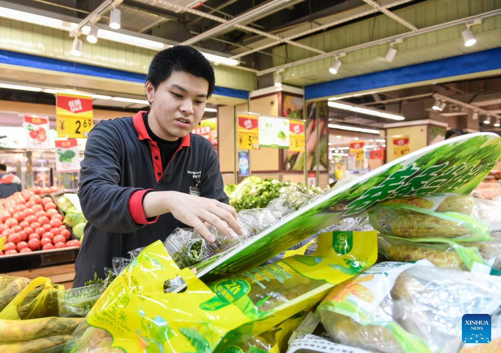 Autistic youth Ran Yulong, works at a supermarket in Shenzhen, south China's Guangdong Province, March 22, 2024. Ran Yulong, 19, works ninety-six hours a month at the supermarket since September 2023. His main work is to sort out the goods in the fresh fruit and vegetable area and check the shelf life of the products. He shopped at the supermarket since he was a child and now became an employee here. This Tuesday marks the 17th World Autism Awareness Day. In south China's Shenzhen, some autistic youth, who were called "children of the stars," have integrated into society and are chasing their dreams.?(Xinhua/Mao Siqian)