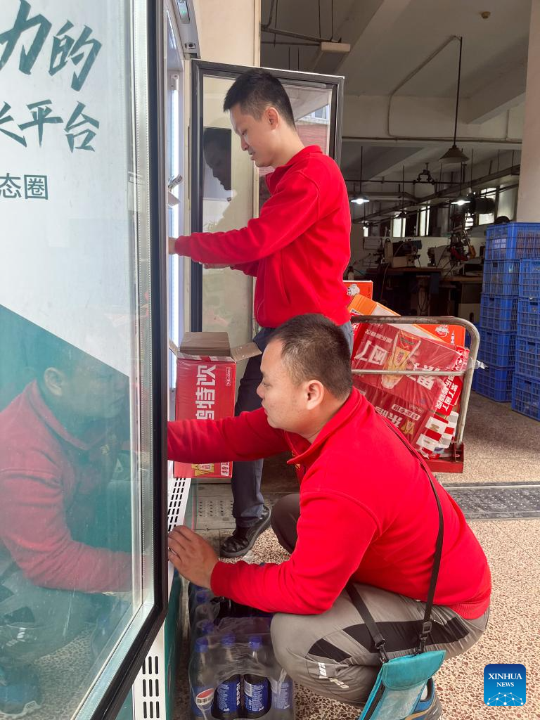 Autistic youth Huang Xuanning works at an industrial park in Shenzhen, south China's Guangdong Province, March 21, 2024. Huang Xuanning, 24, joined the industrial park in September 2023. He is responsible for loading vending machines in the factory area, including handling and placing snacks and drinks. Now he is basically qualified for the job with the help of team partners. This Tuesday marks the 17th World Autism Awareness Day. In south China's Shenzhen, some autistic youth, who were called "children of the stars," have integrated into society and are chasing their dreams.?(Xinhua/Mao Siqian)