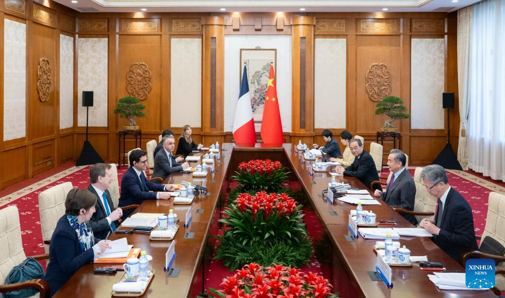 BEIJING, April 1 (Xinhua) -- Chinese Foreign Minister Wang Yi held talks with Stephane Sejourne, French minister for Europe and foreign affairs, in Beijing on Monday to discuss closer bilateral ties.