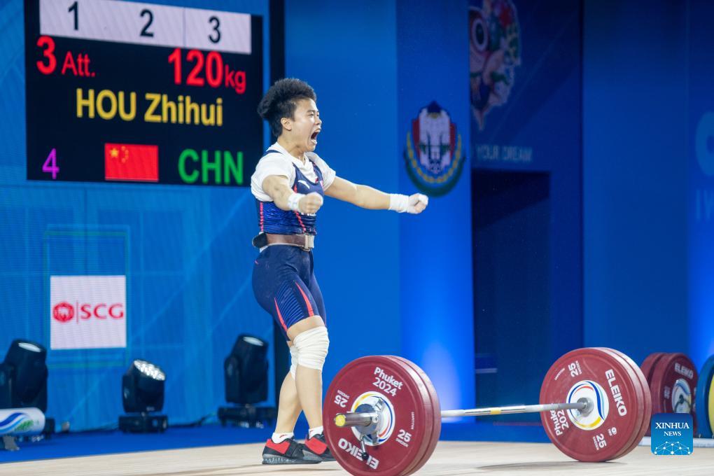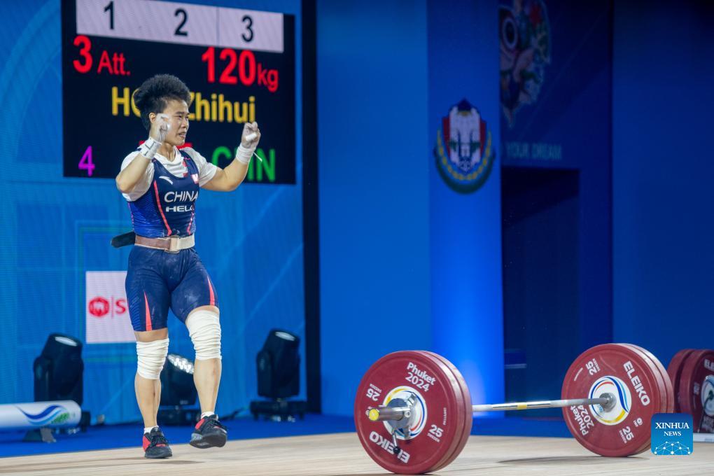 Hou Zhihui of China celebrates after a successful attempt in the women's 49kg competition at the IWF World Cup in Phuket, Thailand, April 1, 2024. (Xinhua/Lin Hao)