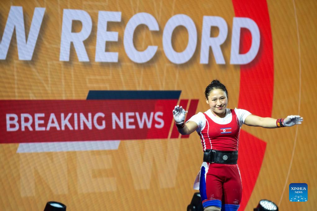 Ri Song Gum of the Democratic People's Republic of Korea (DPRK) celebrates after breaking the world record with 221kg in total in the women's 49kg competition at the IWF World Cup in Phuket, Thailand, April 1, 2024. (Xinhua/Lin Hao)