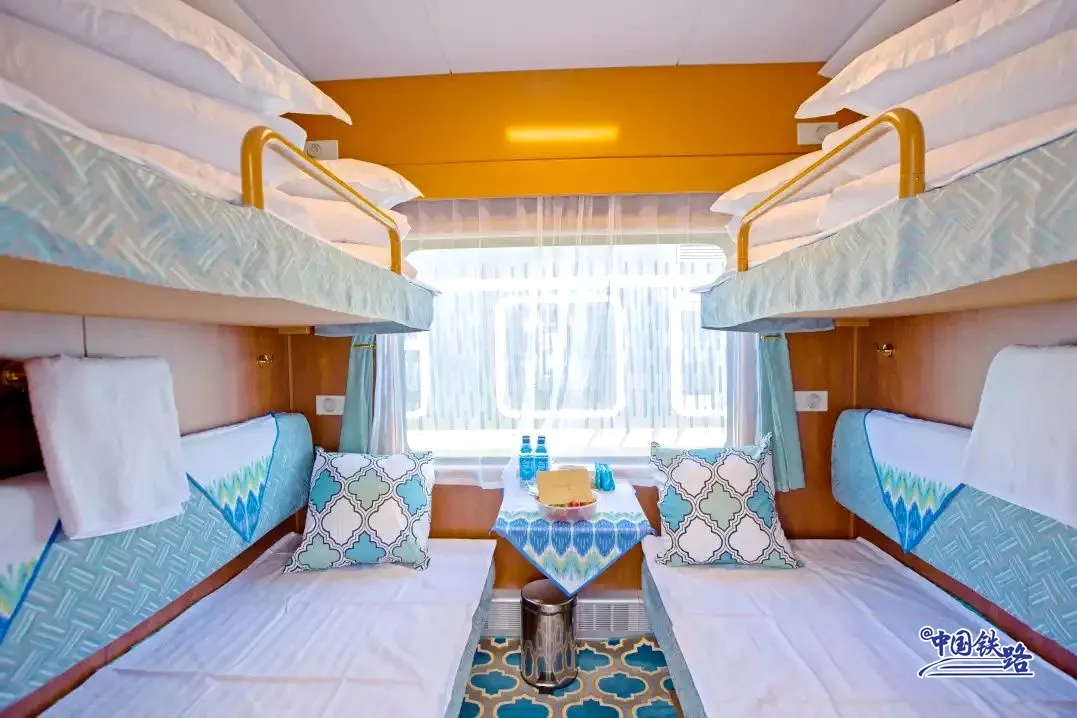 Photo shows the interior of the blue diamond class carriage of New Orient Express, a tourist-dedicated train that offers high-quality train travel around northwest China's Xinjiang Uygur Autonomous Region. (Photo/China Railway)