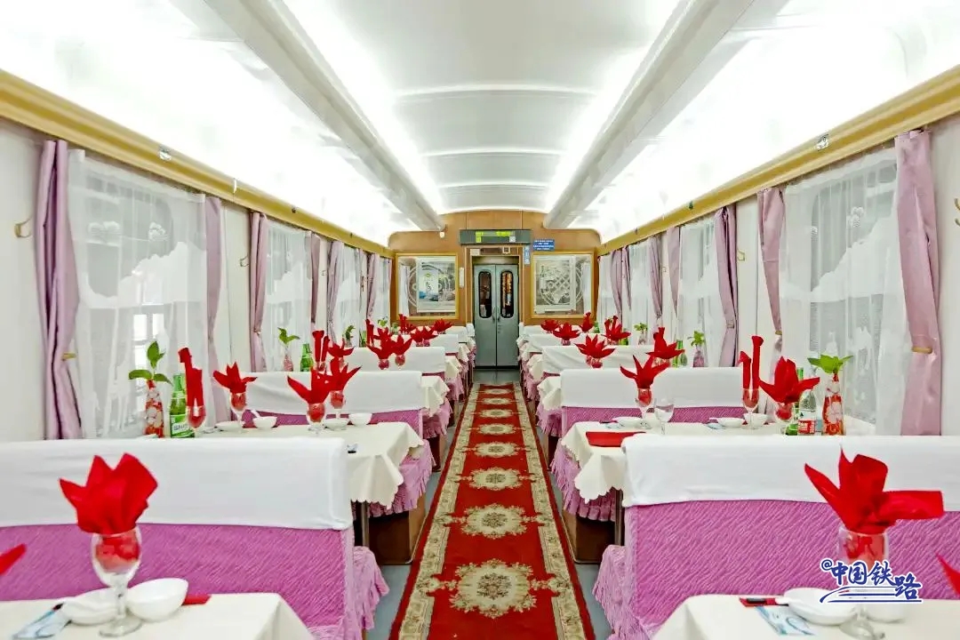 Photo shows the interior of the dining carriage of New Orient Express, a tourist-dedicated train that offers high-quality train travel around northwest China's Xinjiang Uygur Autonomous Region. (Photo/China Railway)